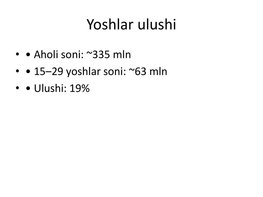 Yoshlar ulushi• • Aholi soni: ~335 mln