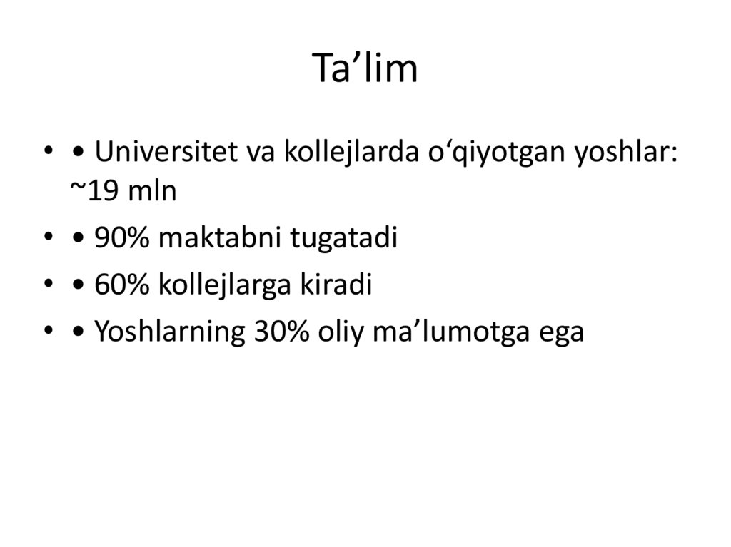 Ta’lim• • Universitet va kollejlarda o‘qiyotgan yoshlar: