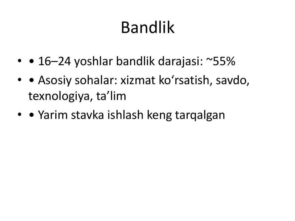 Bandlik• • 16–24 yoshlar bandlik darajasi: ~55%