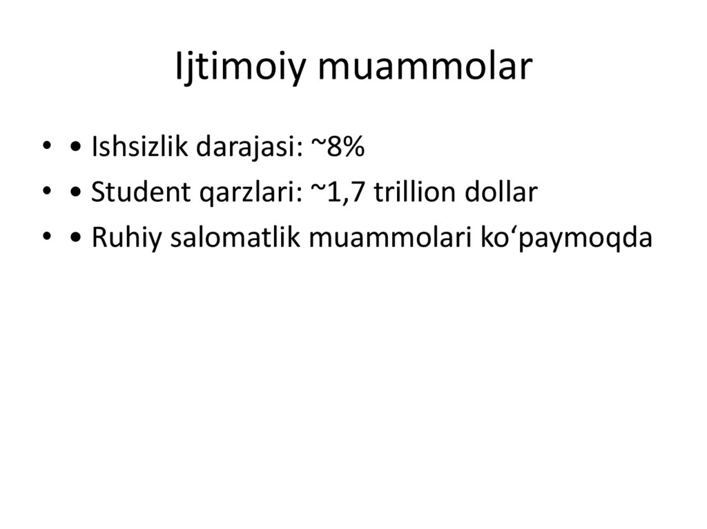 Ijtimoiy muammolar• • Ishsizlik darajasi: ~8%