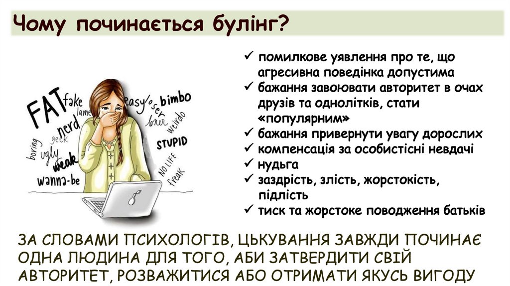 Чому починається булінг?ЗА СЛОВАМИ ПСИХОЛОГІВ, ЦЬКУВАННЯ ЗАВЖДИ ПОЧИНАЄ