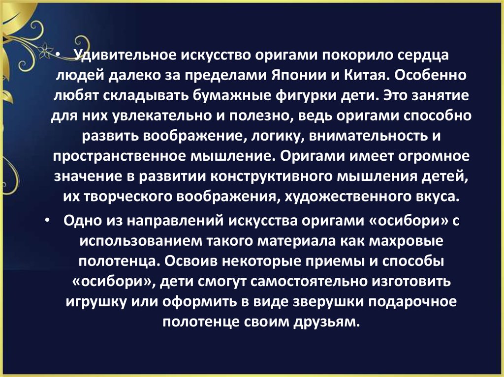 После прохождения практики дети научатся азамискусства оригами из полотенец «Осибори», смогут