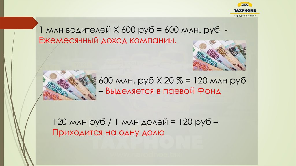 1 водитель Х 600 руб х 12 % = 72руб16. Ваш доход составит:
