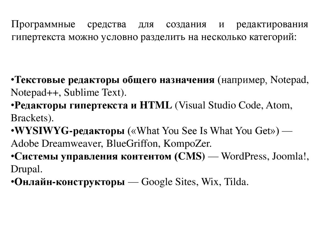 Программные средства для создания и редактированиягипертекста можно условно разделить на несколько категорий: