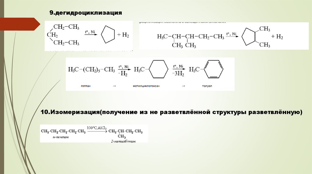 9.дегидроциклизация10.Изомеризация(получение из не разветвлённой структуры разветвлённую)