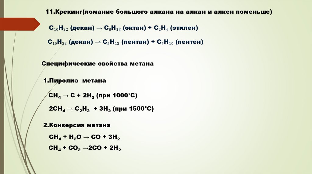 11.Крекинг(ломание большого алкана на алкан и алкен поменьше)C₁₀H₂₂ (декан) → C₈H₁₈ (октан) + C₂H₄ (этилен)