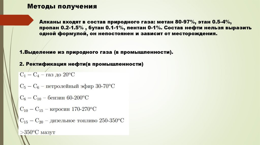 Методы полученияАлканы входят в состав природного газа: метан 80-97%, этан 0.5-4%,