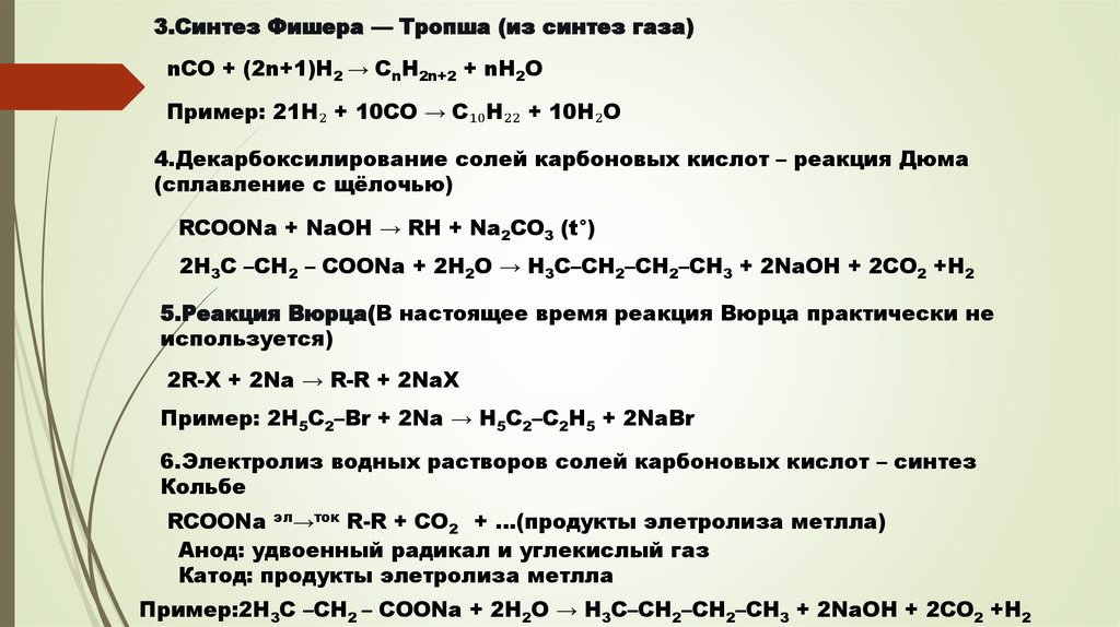 3.Синтез Фишера — Тропша (из синтез газа)nCO + (2n+1)H2 → CnH2n+2 + nH2O