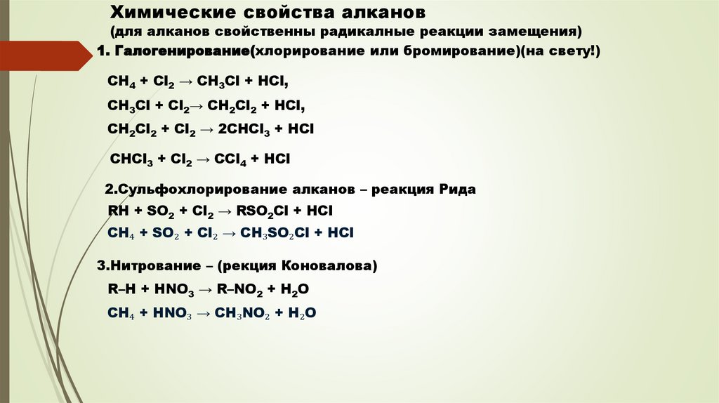 Химические свойства алканов(для алканов свойственны радикалные реакции замещения)