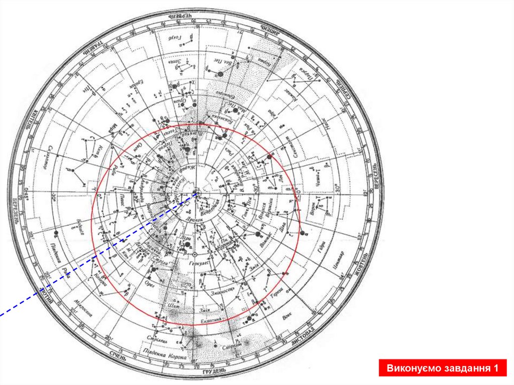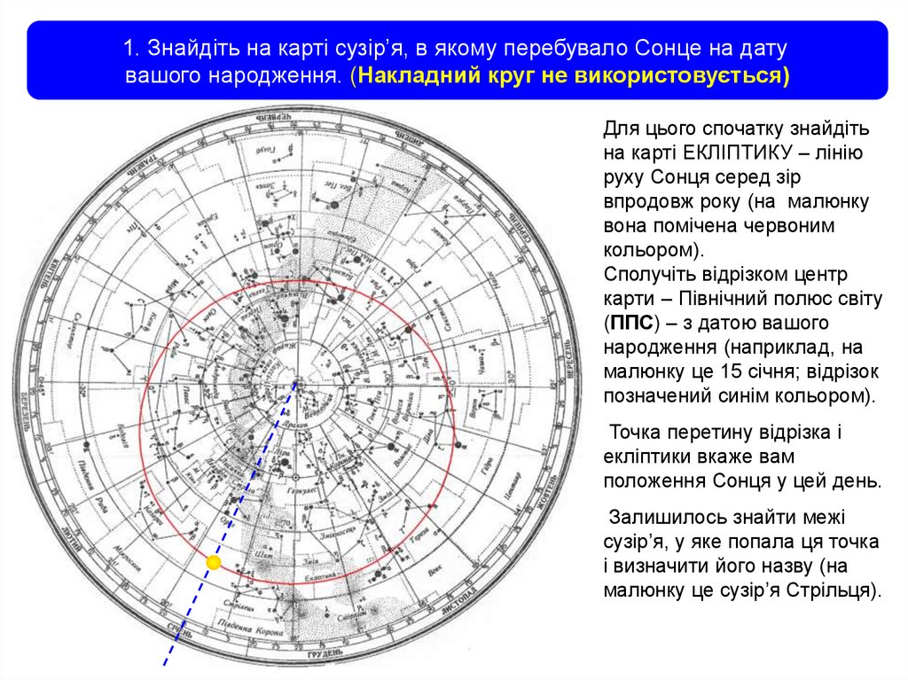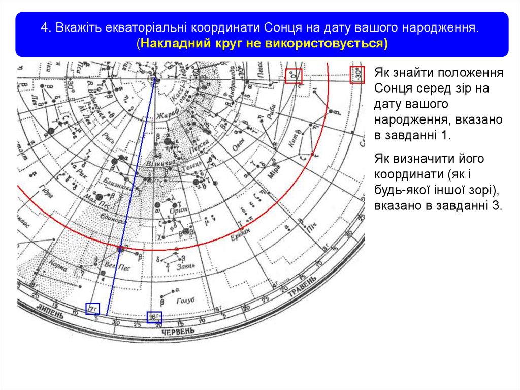 1. Знайдіть на карті сузір’я, в якому перебувало Сонце на датувашого народження. (Накладний круг не використовується)