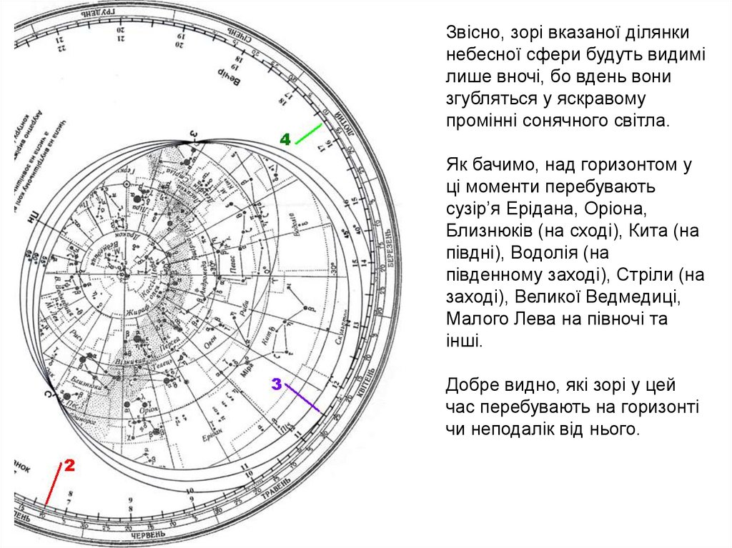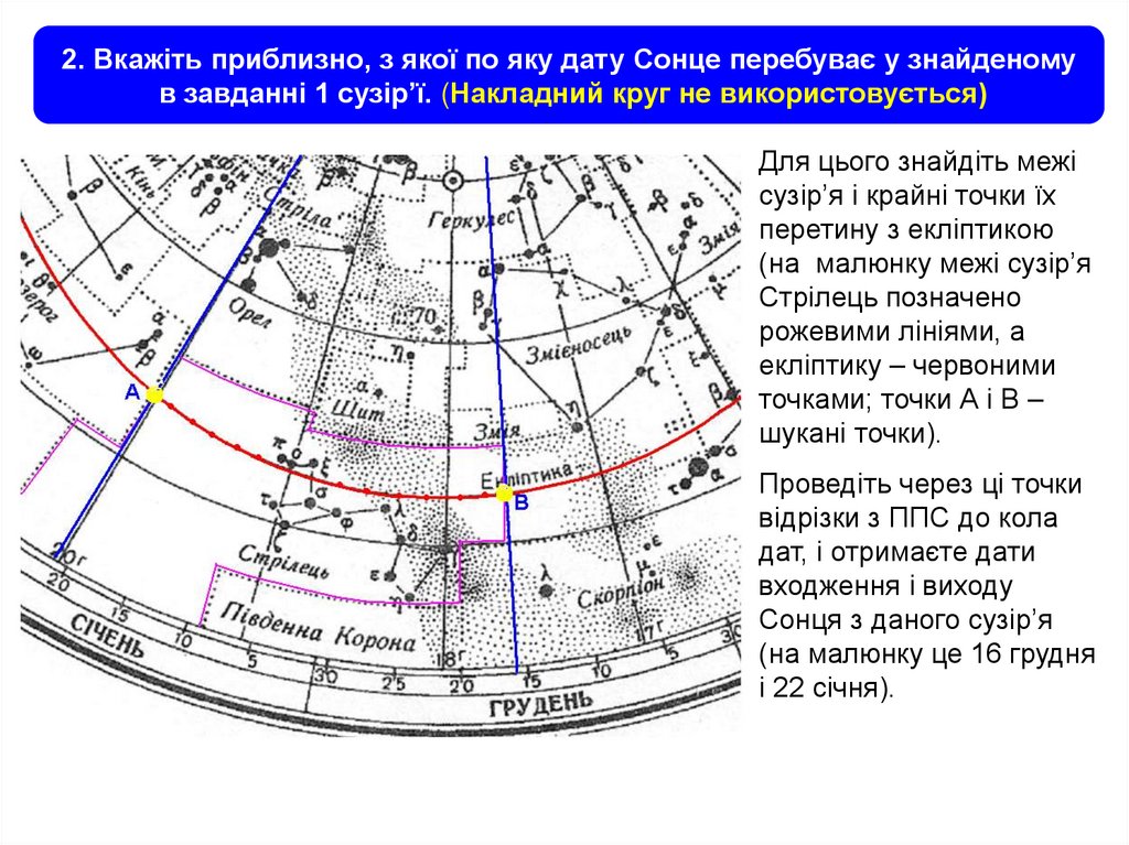 2. Вкажіть приблизно, з якої по яку дату Сонце перебуває у знайденомув завданні 1 сузір’ї. (Накладний круг не використовується)