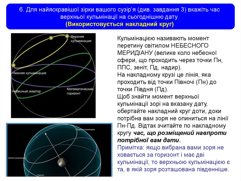 6. Для найяскравішої зірки вашого сузір’я (див. завдання 3) вкажіть часверхньої кульмінації на сьогоднішню дату.