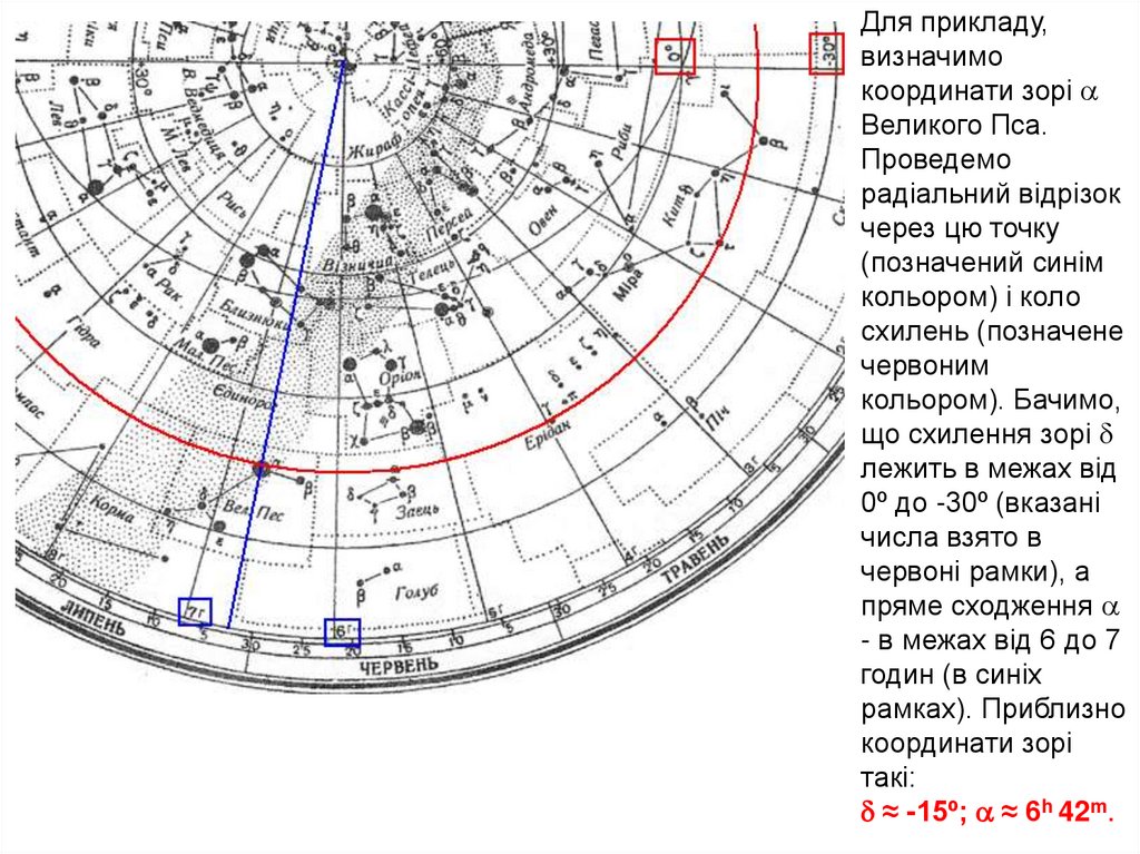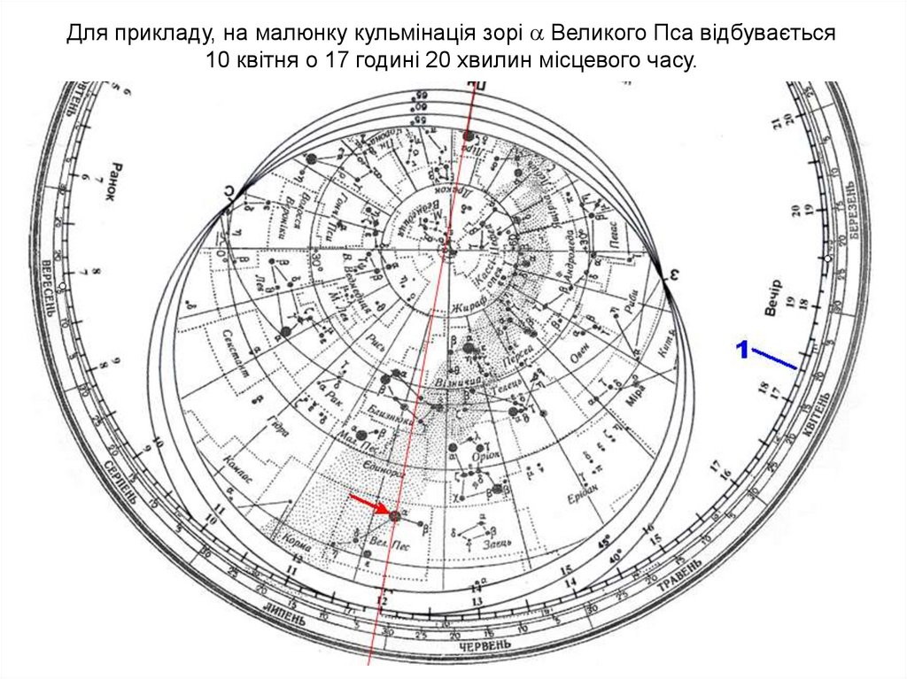 Для прикладу, на малюнку кульмінація зорі Великого Пса відбувається10 квітня о 17 годині 20 хвилин місцевого часу.