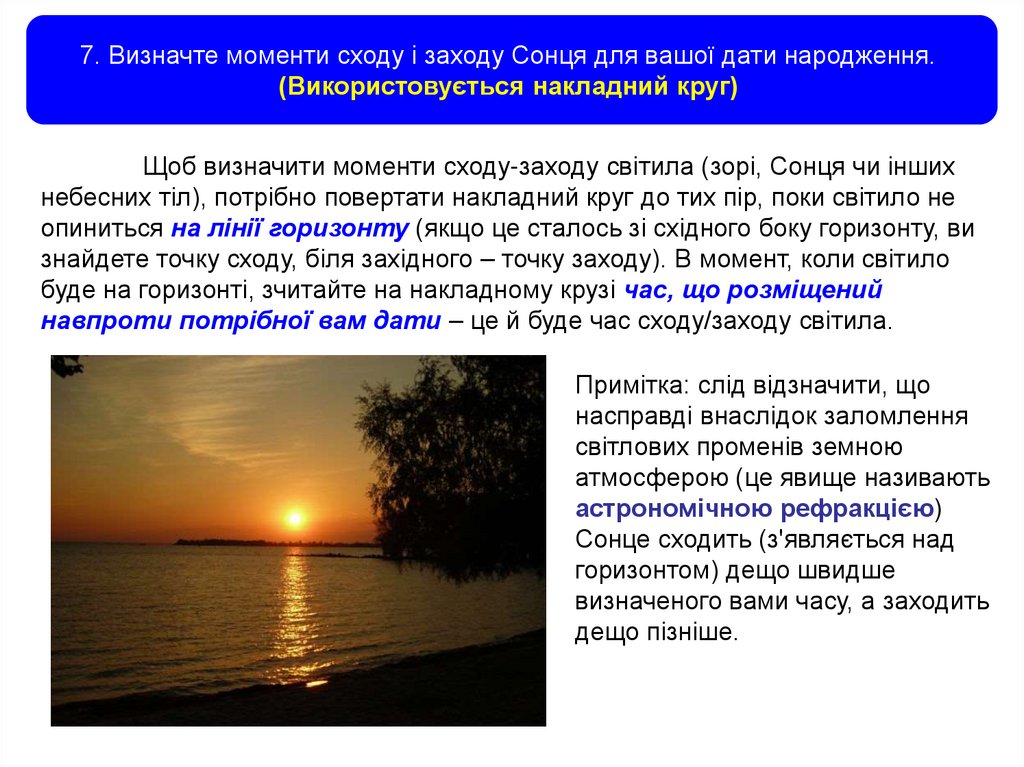7. Визначте моменти сходу і заходу Сонця для вашої дати народження.(Використовується накладний круг)