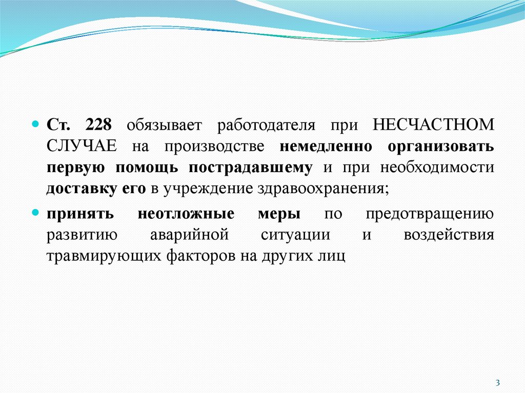 Ст. 228 обязывает работодателя при НЕСЧАСТНОМСЛУЧАЕ на производстве немедленно организовать