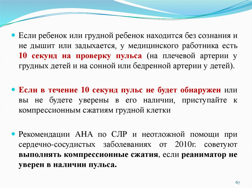 10 секунд на проверку пульса (на плечевой артерии у