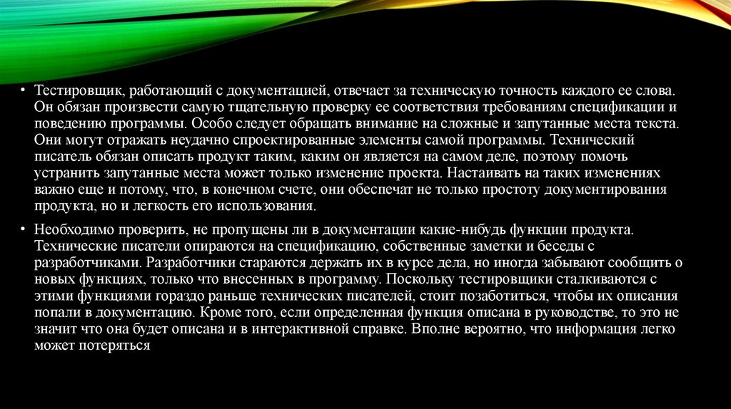 • Тестировщик, работающий с документацией, отвечает за техническую точность каждого ее слова.Он обязан произвести самую тщательную проверку ее соответствия требованиям спецификации и