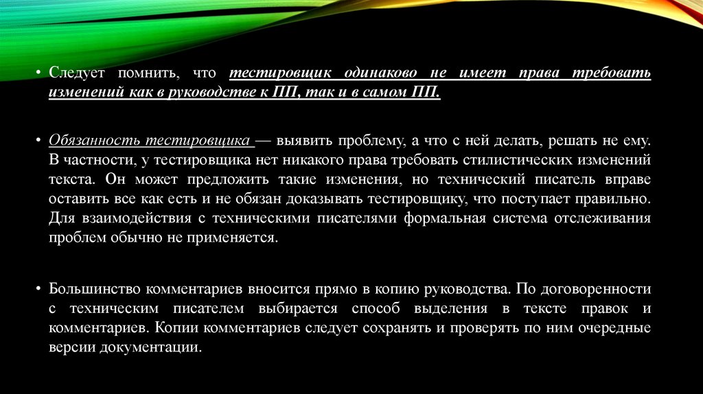 • Следует помнить, что тестировщик одинаково не имеет права требоватьизменений как в руководстве к ПП, так и в самом ПП.