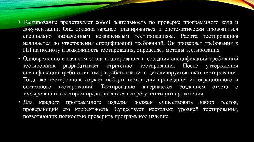 • Тестирование представляет собой деятельность по проверке программного кода идокументации. Она должна заранее планироваться и систематически проводиться