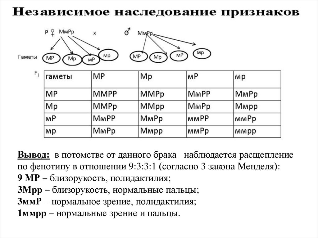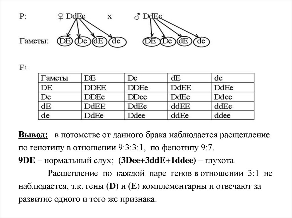 Вывод: в потомстве от данного брака наблюдается расщеплениепо генотипу в отношении 9:3:3:1, по фенотипу 9:7.