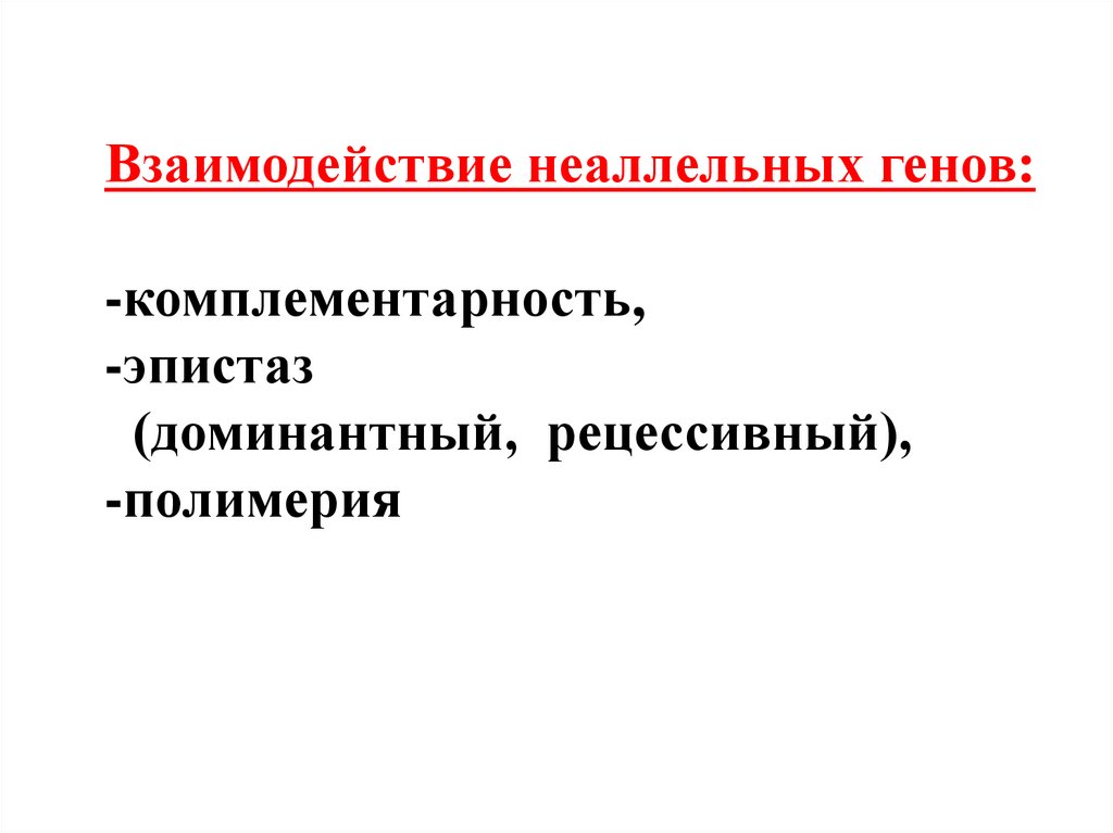 2. Взаимодействие аллельных генов: -Полное доминирование -Неполное доминирование -Кодоминирование -Сверхдоминирование