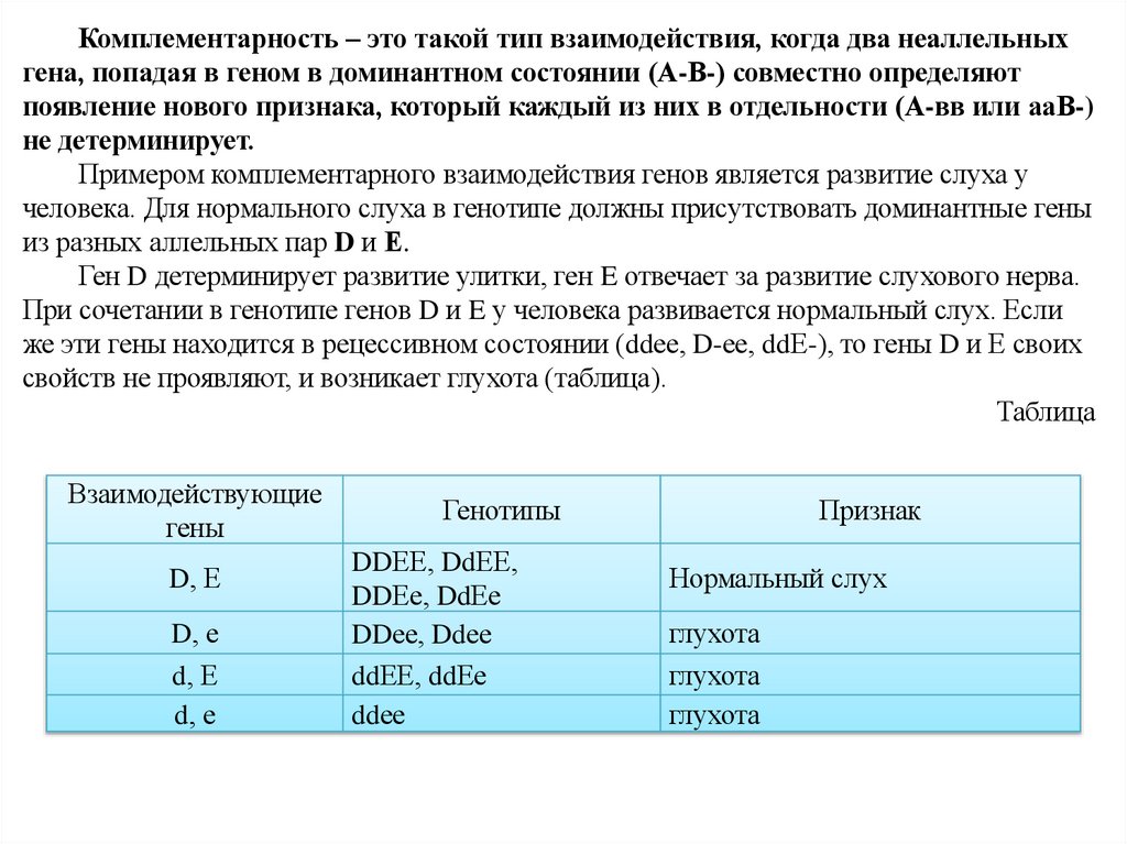 Примером комплементарного взаимодействия генов является развитие слуха у