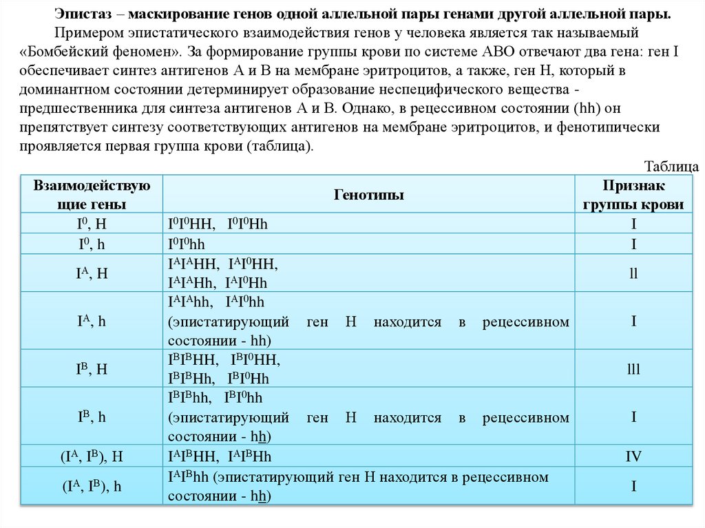 Эпистаз – маскирование генов одной аллельной пары генами другой аллельной пары.Примером эпистатического взаимодействия генов у человека является так называемый