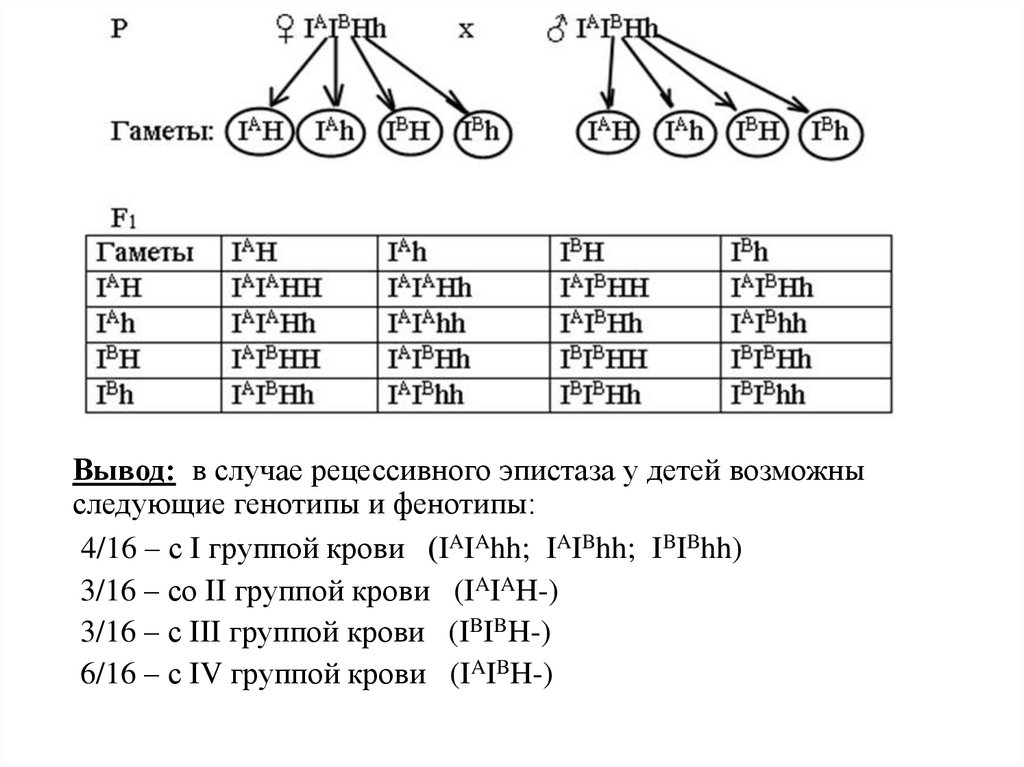 Вывод: в случае рецессивного эпистаза у детей возможныследующие генотипы и фенотипы: