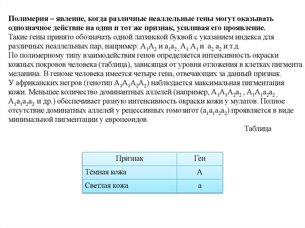 Полимерия – явление, когда различные неаллельные гены могут оказыватьоднозначное действие на один и тот же признак, усиливая его проявление.
