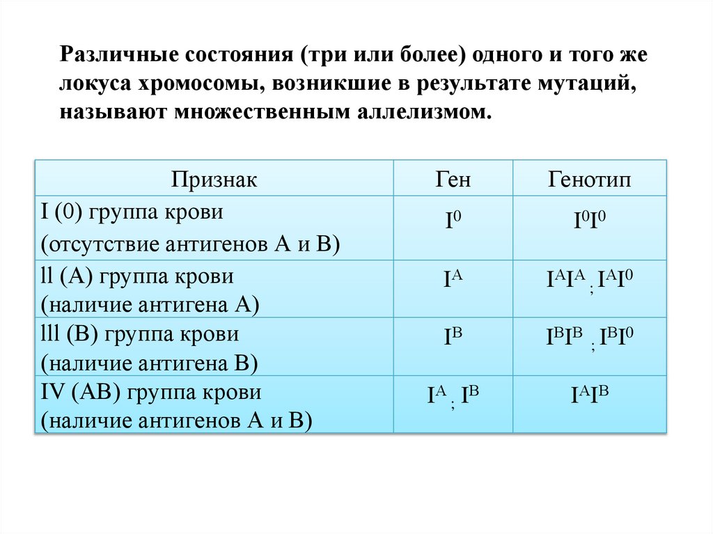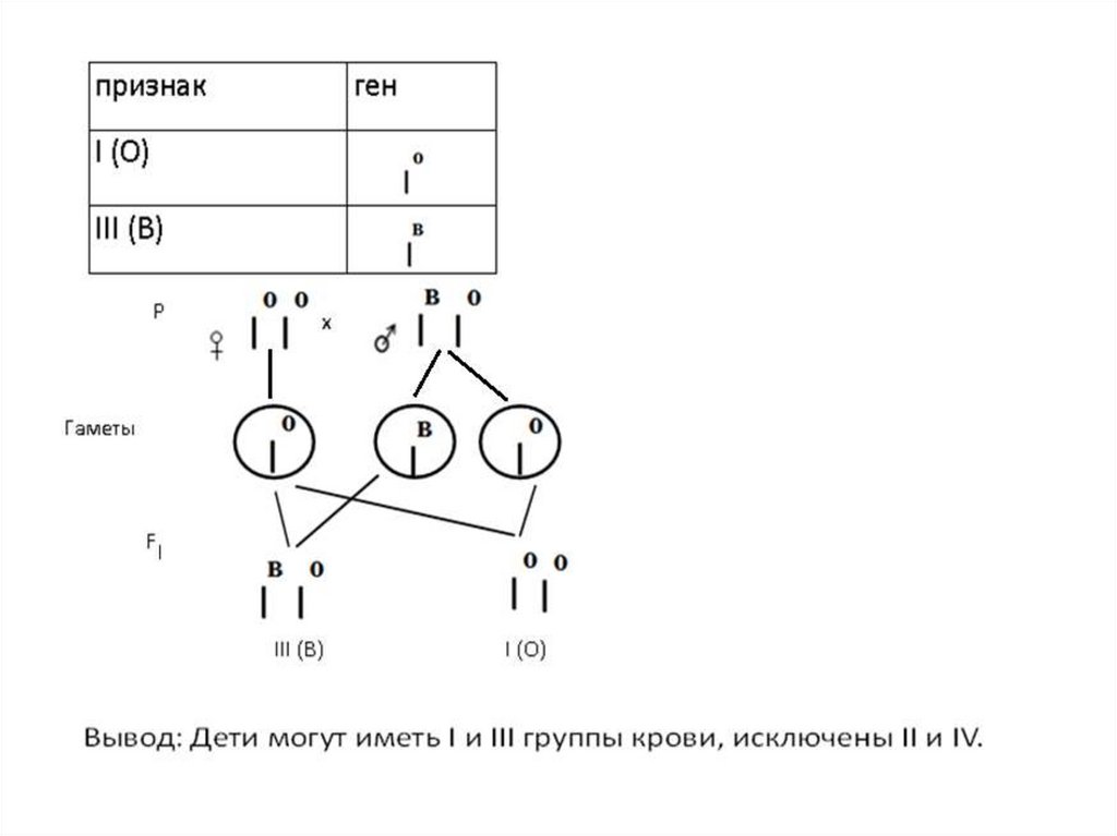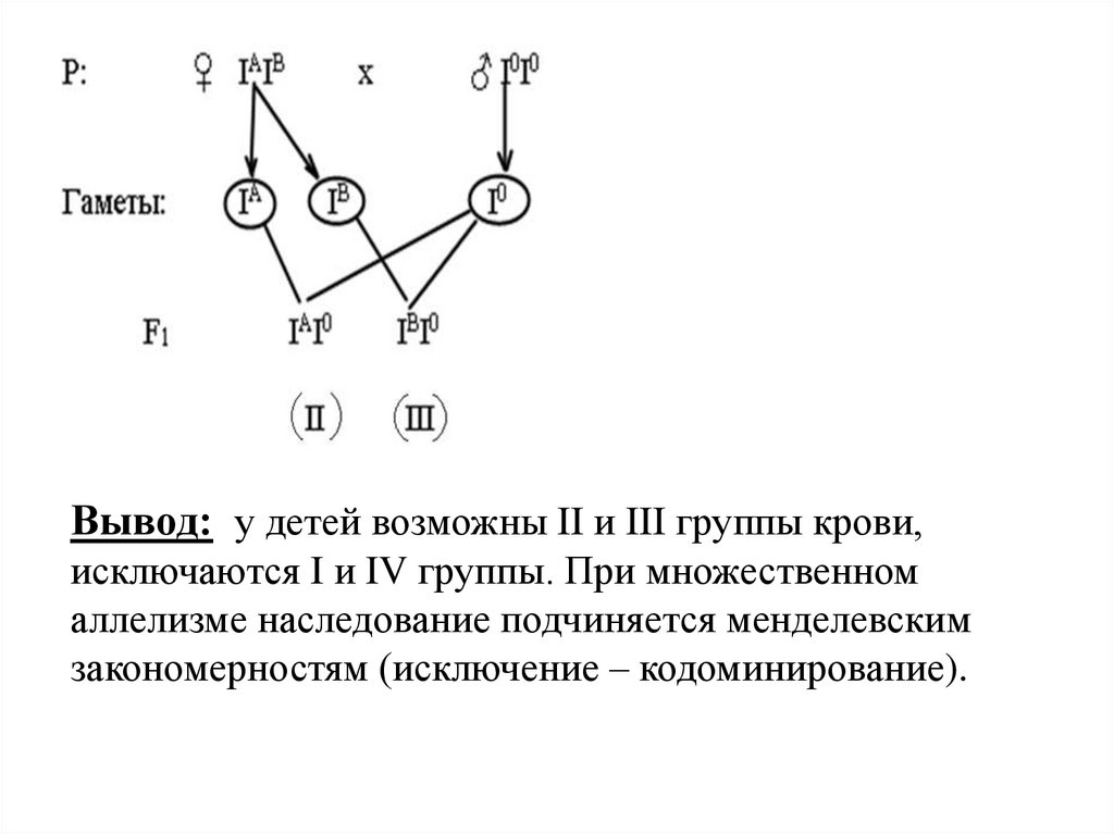 Вывод: у детей возможны II и III группы крови,исключаются I и IV группы. При множественном