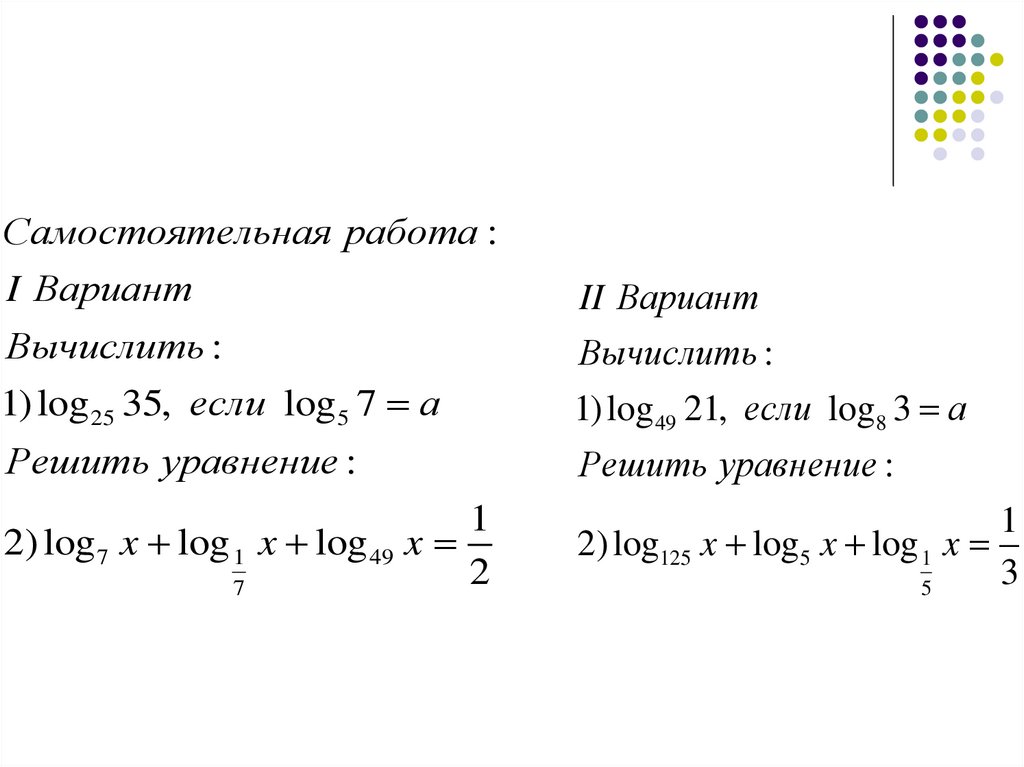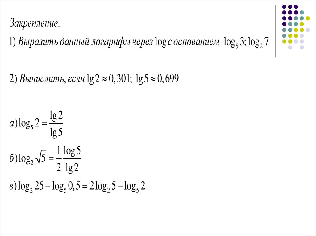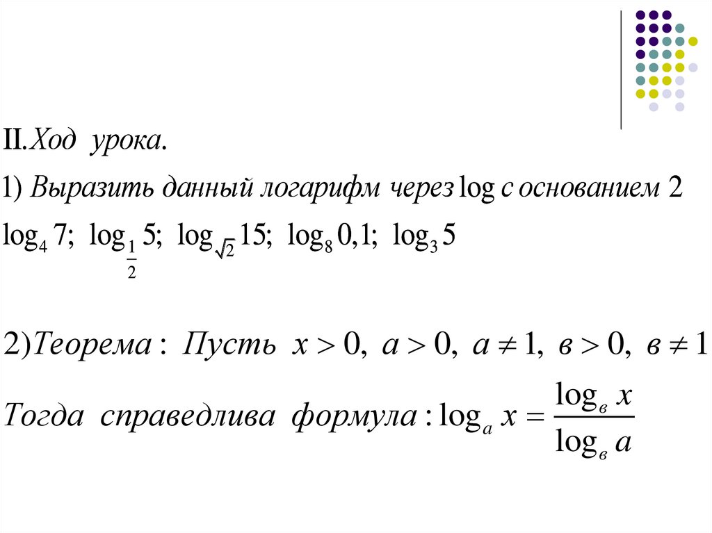 II. Ход урока.1) Выразить данный логарифм через log с основанием 2