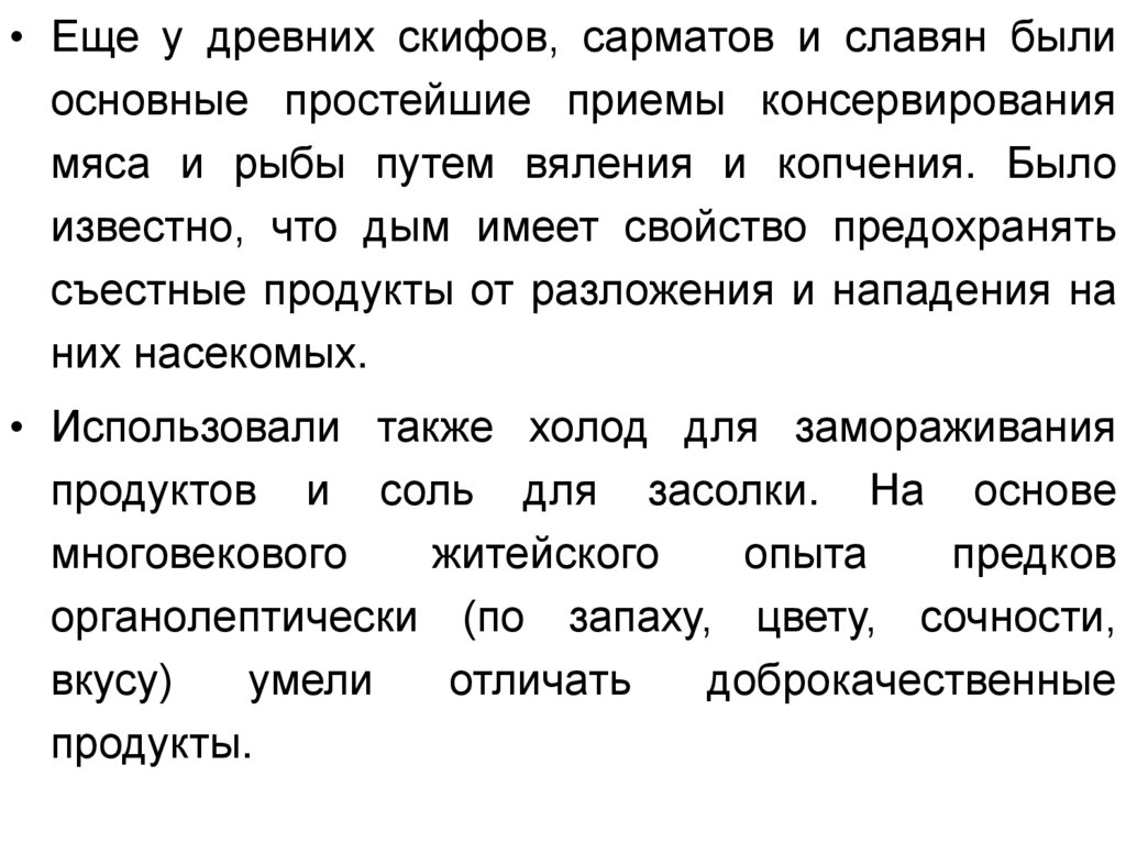 • Еще у древних скифов, сарматов и славян былиосновные простейшие приемы консервирования