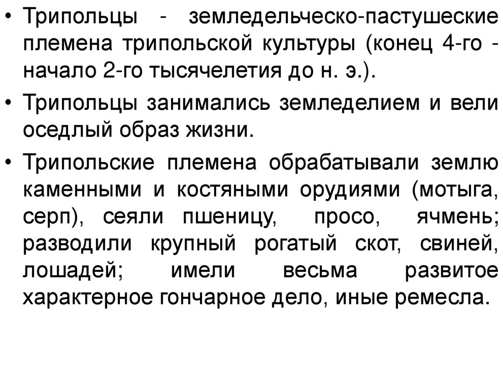 • Трипольцы - земледельческо-пастушескиеплемена трипольской культуры (конец 4-го начало 2-го тысячелетия до н. э.).