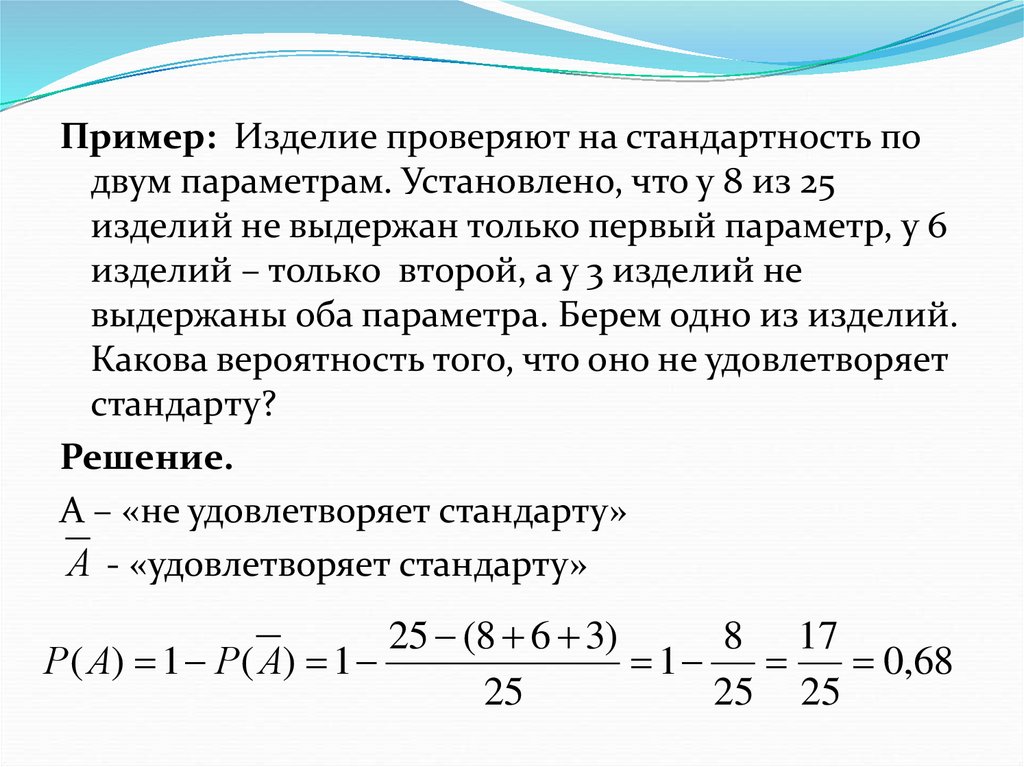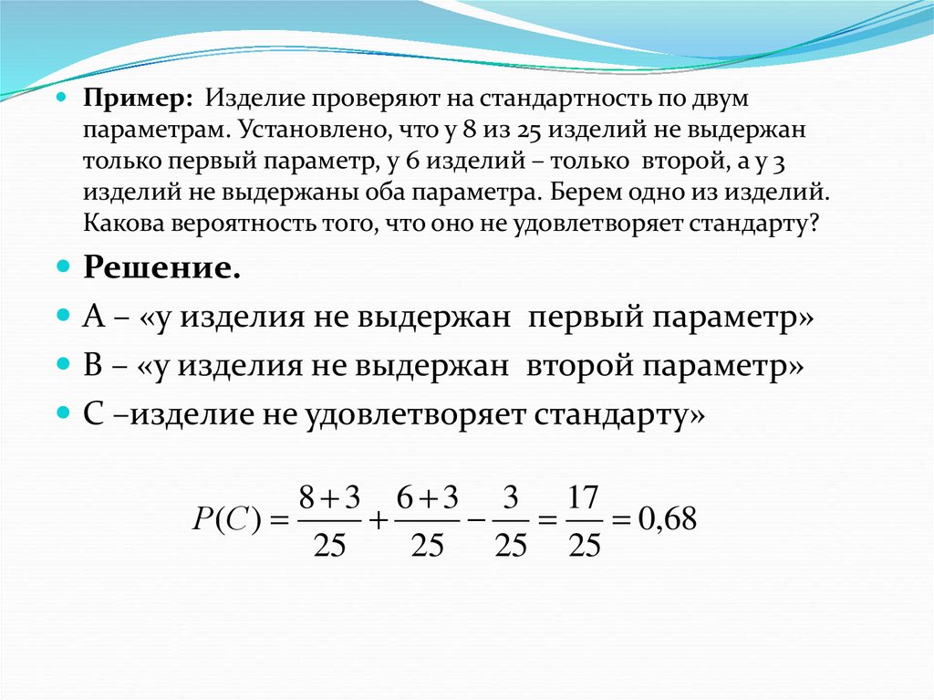 Пример: Изделие проверяют на стандартность подвум параметрам. Установлено, что у 8 из 25