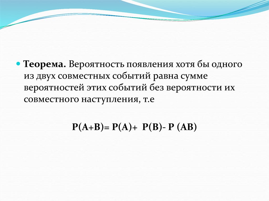 Теорема. Вероятность появления хотя бы одногоиз двух совместных событий равна сумме