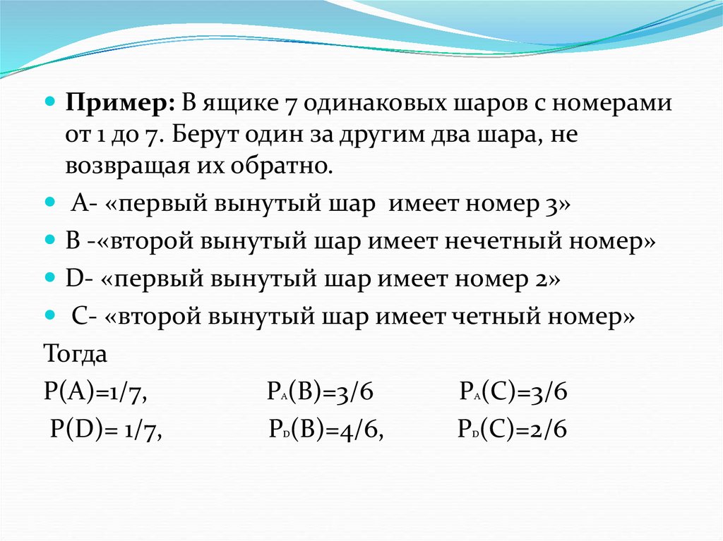 Пример: В ящике 7 одинаковых шаров с номерамиот 1 до 7. Берут один за другим два шара, не