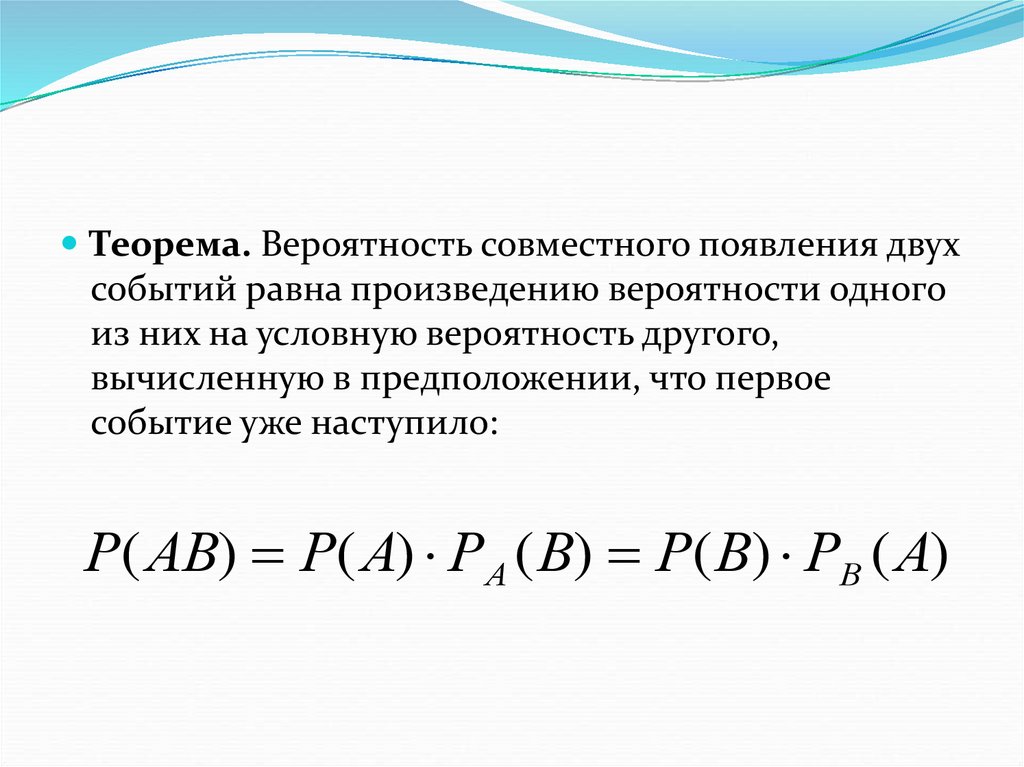 Теорема. Вероятность совместного появления двухсобытий равна произведению вероятности одного