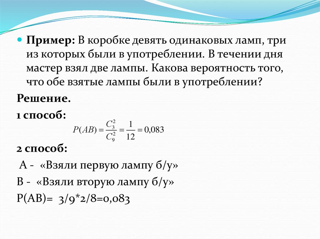 Пример: В коробке девять одинаковых ламп, трииз которых были в употреблении. В течении дня