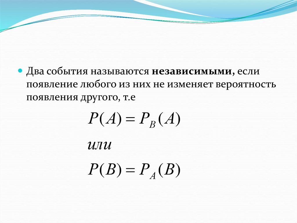 Два события называются независимыми, еслипоявление любого из них не изменяет вероятность