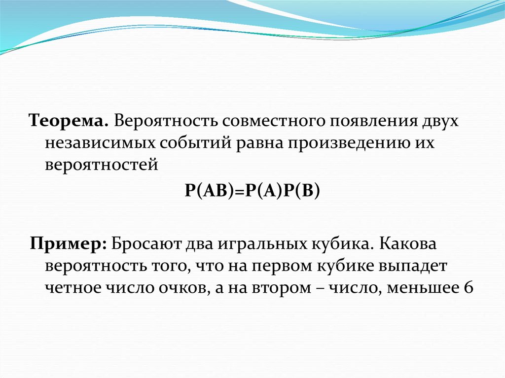 Теорема. Вероятность совместного появления двухнезависимых событий равна произведению их
