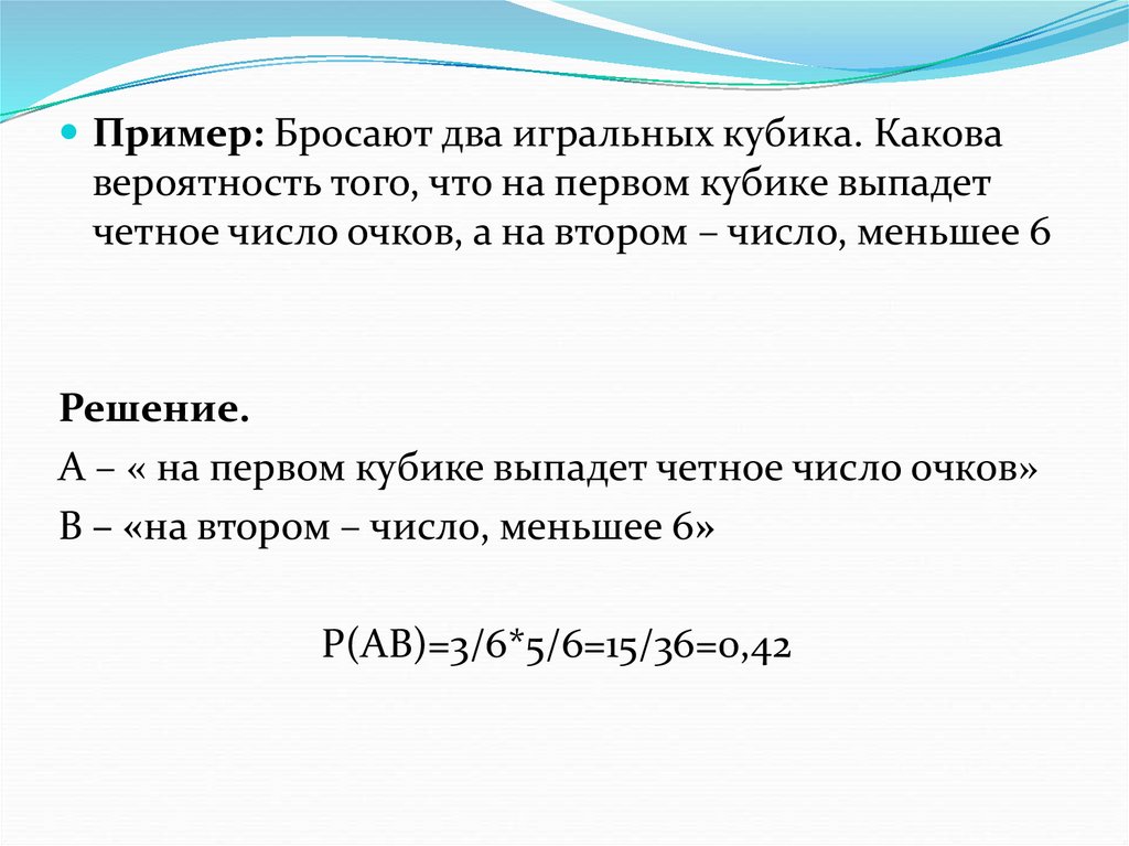 Пример: Бросают два игральных кубика. Каковавероятность того, что на первом кубике выпадет