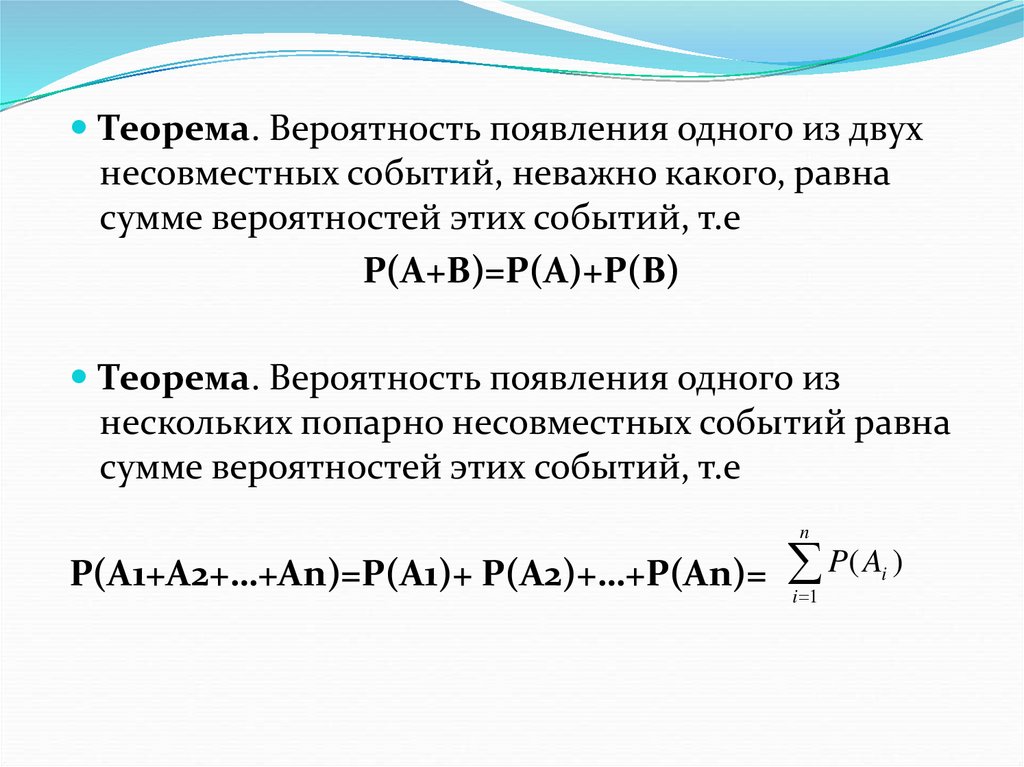 Теорема. Вероятность появления одного из двухнесовместных событий, неважно какого, равна