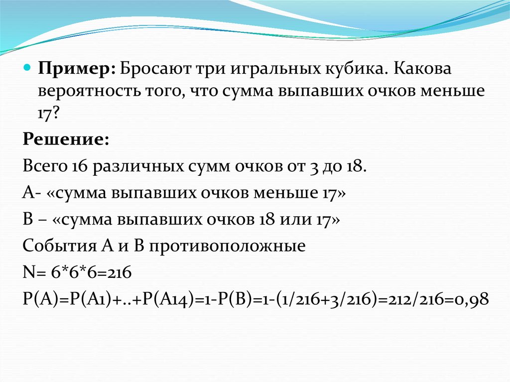 Пример: Бросают три игральных кубика. Каковавероятность того, что сумма выпавших очков меньше