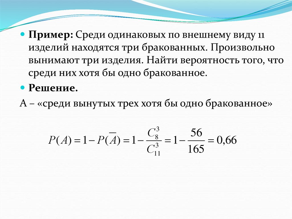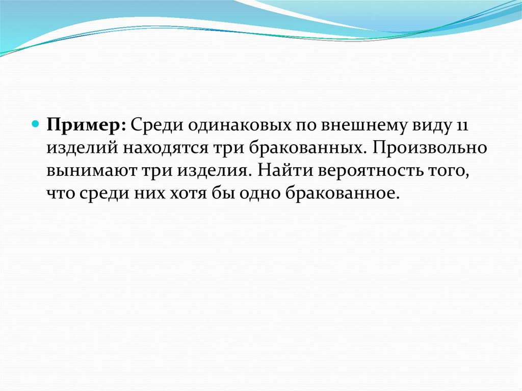 Пример: Среди одинаковых по внешнему виду 11изделий находятся три бракованных. Произвольно