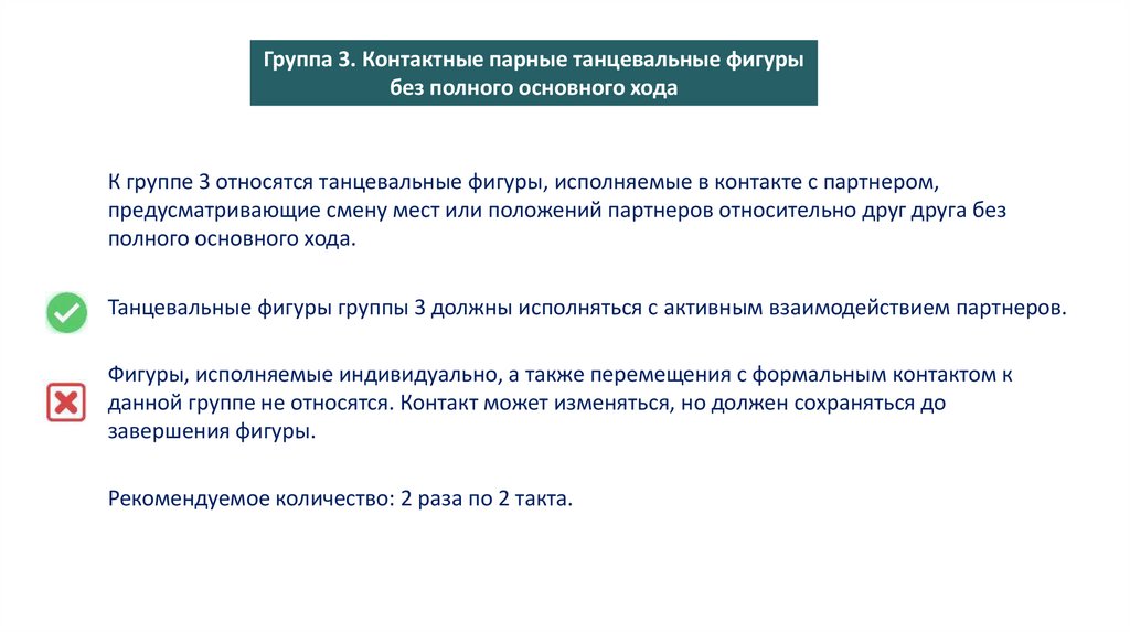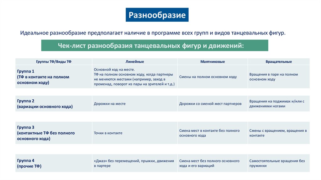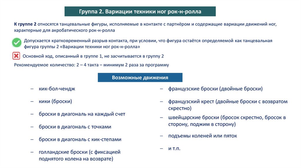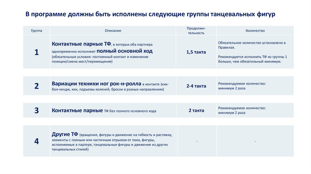 В программе должны быть исполнены следующие группы танцевальных фигурГруппа