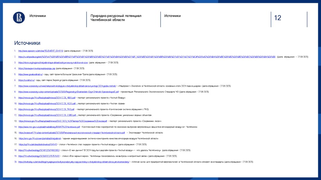 https://www.ecosociety.ru/news/natsproekt-ekologiya-v-chelyabinskoj-oblasti-osnovnye-itogi-2024-goda-v-tsifrah/ - «Нацпроект «Экология» в Челябинской области: основные итоги 2024 года в цифрах» (дата обращения - 27.09.2025)