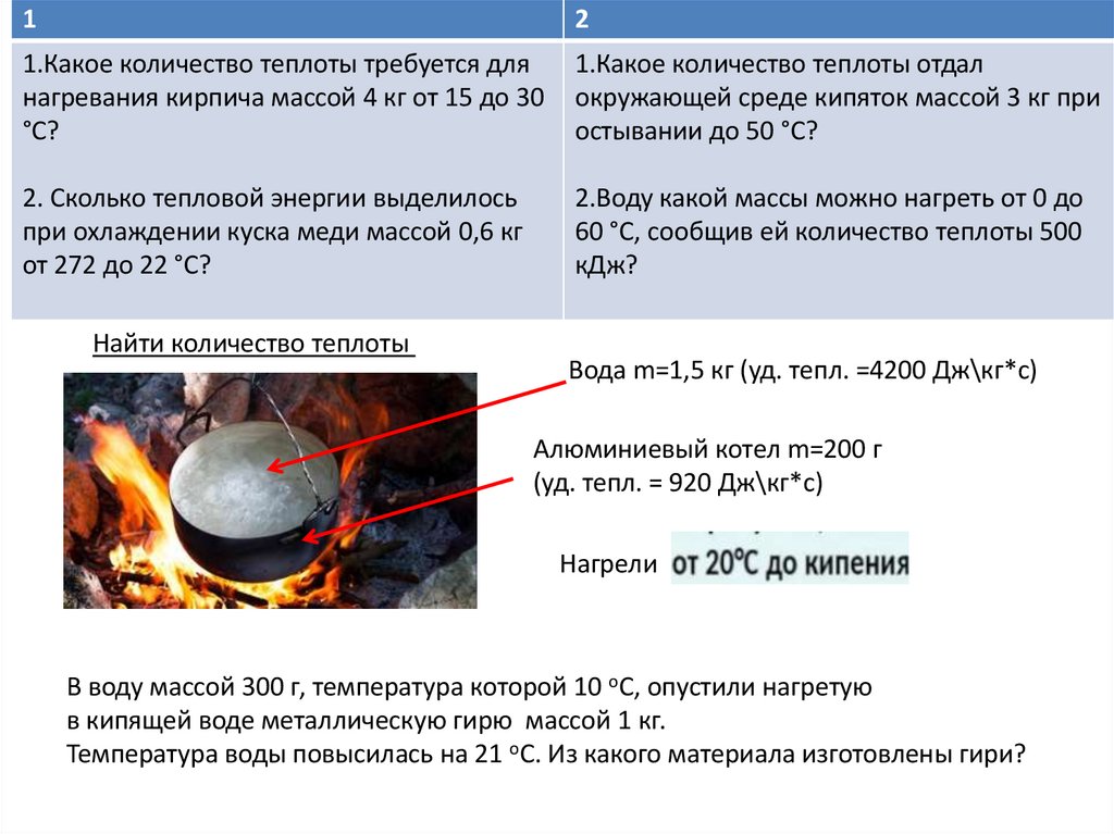 нагревания кирпича массой 4 кг от 15 до 30