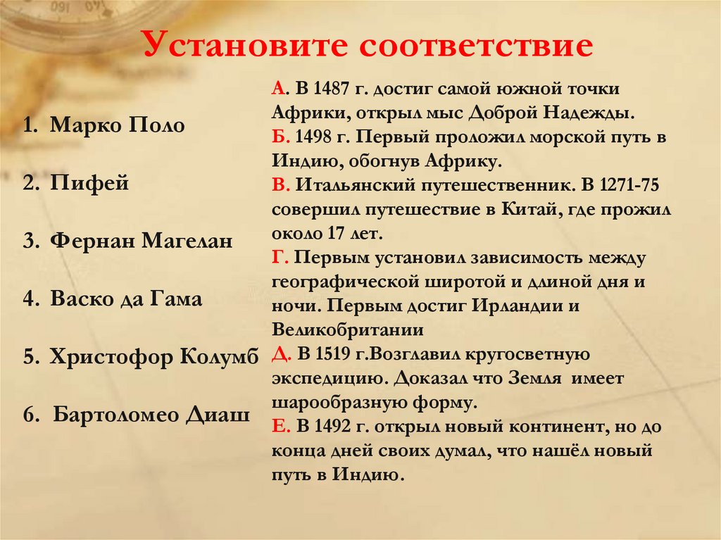 Установите соответствиеА. В 1487 г. достиг самой южной точки