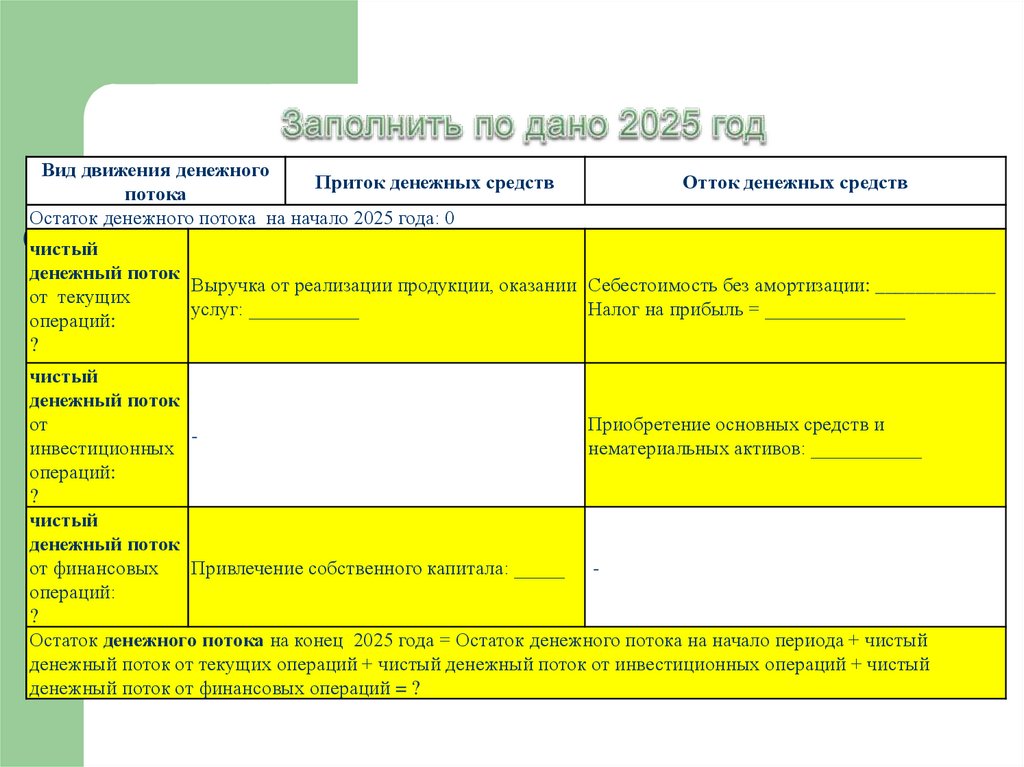 Остаток денежного потока на конец 2025 года = Остаток денежного потока на начало периода + чистый