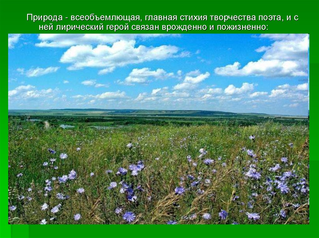 Природа - всеобъемлющая, главная стихия творчества поэта, и сней лирический герой связан врожденно и пожизненно: